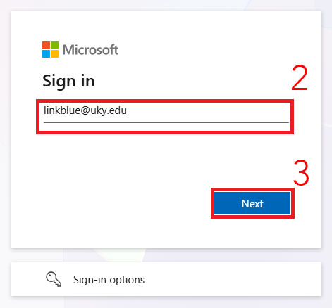 Step 2. In the Microsoft login prompt, enter your linkblue with @uky.edu included.